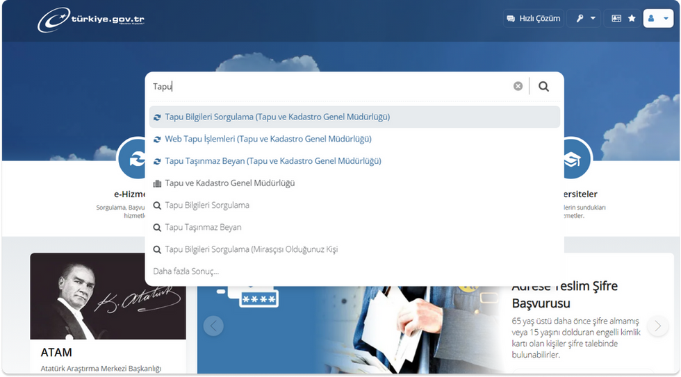 Arama alanından “Tapu Bilgileri Sorgulama” hizmetini seçin.
